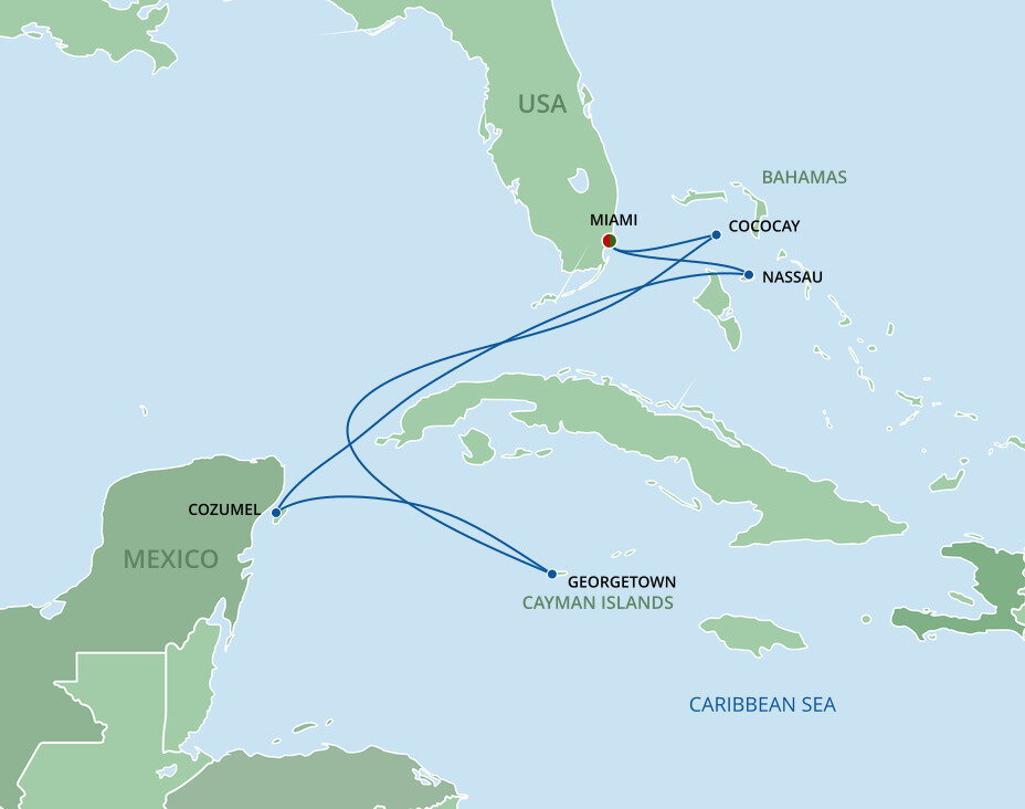 This multicultural city where the sun rules supreme is more than just a cruise port. Palm-lined causeways stretch across luminous Biscayne Bay as Miami rises in a gleam of glass towers, Art Deco curves, and tropical colour. Along Ocean Drive in South Beach, pastel facades from the 1930s glow beneath the Florida sun, while nearby Little Havana hums with domino parks, cigar shops, and the aroma of Cuban coffee. Beyond the shoreline, calm waters, yacht marinas, and breezy promenades frame a city shaped by Caribbean rhythms and sunlit coastal glamour.