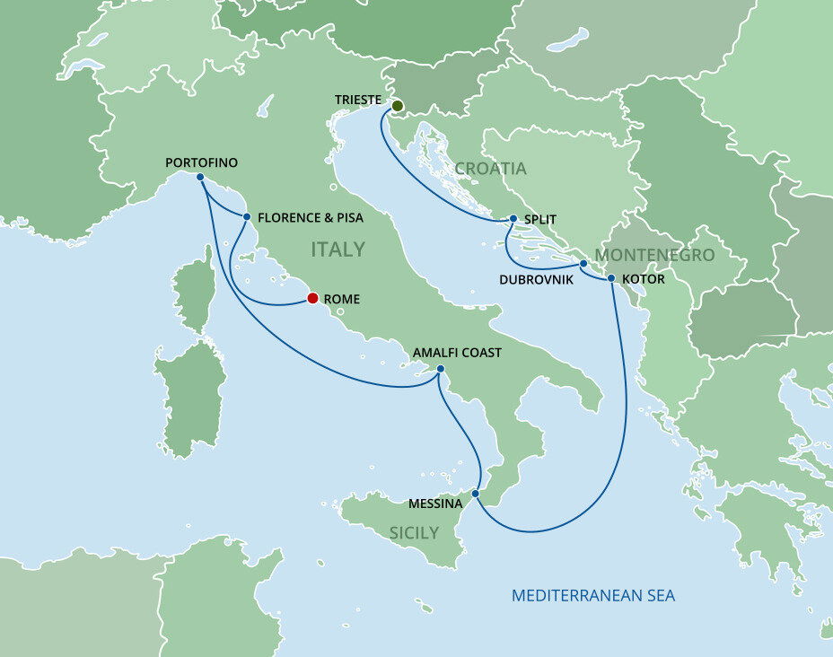 Venice is approximately 150 kilometers (93 miles) away, a journey that takes about 2 hours by train if you are making your own way to Trieste from Venice. Alternatively, your cruise documents will outline alternative transfer options.