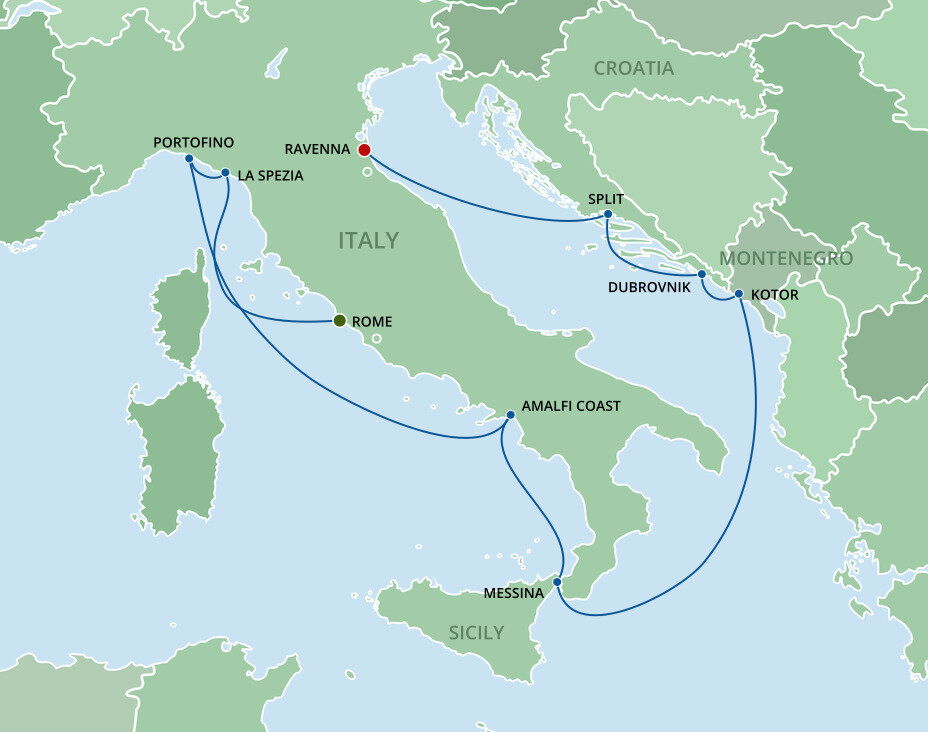 Ravenna, “The Mosaic City”, is best known for its churches which date back 1,500 years and are decorated with stunning Byzantine mosaics. If you're not staying in Ravenna at the end of your cruise, Bologna it's approximately 85 kms (53 miles) away, and Venice is approximately 140 kms (87 miles) away - a journey that takes about 2 hours by train.
