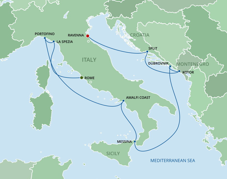 Ravenna, “The Mosaic City”, is best known for its churches which date back 1,500 years and are decorated with stunning Byzantine mosaics. If you're not staying in Ravenna at the end of your cruise, Bologna it's approximately 85 kms (53 miles) away, and Venice is approximately 140 kms (87 miles) away - a journey that takes about 2 hours by train.
