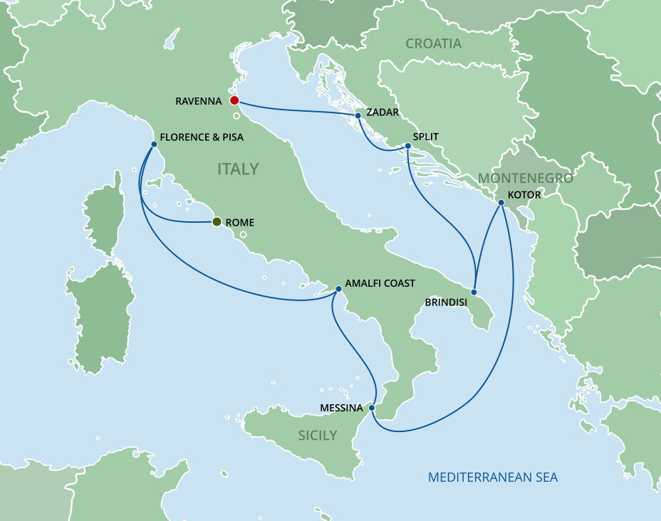 Ravenna, “The Mosaic City”, is best known for its churches which date back 1,500 years and are decorated with stunning Byzantine mosaics. If you're not staying in Ravenna at the end of your cruise, Bologna it's approximately 85 kms (53 miles) away, and Venice is approximately 140 kms (87 miles) away - a journey that takes about 2 hours by train.
