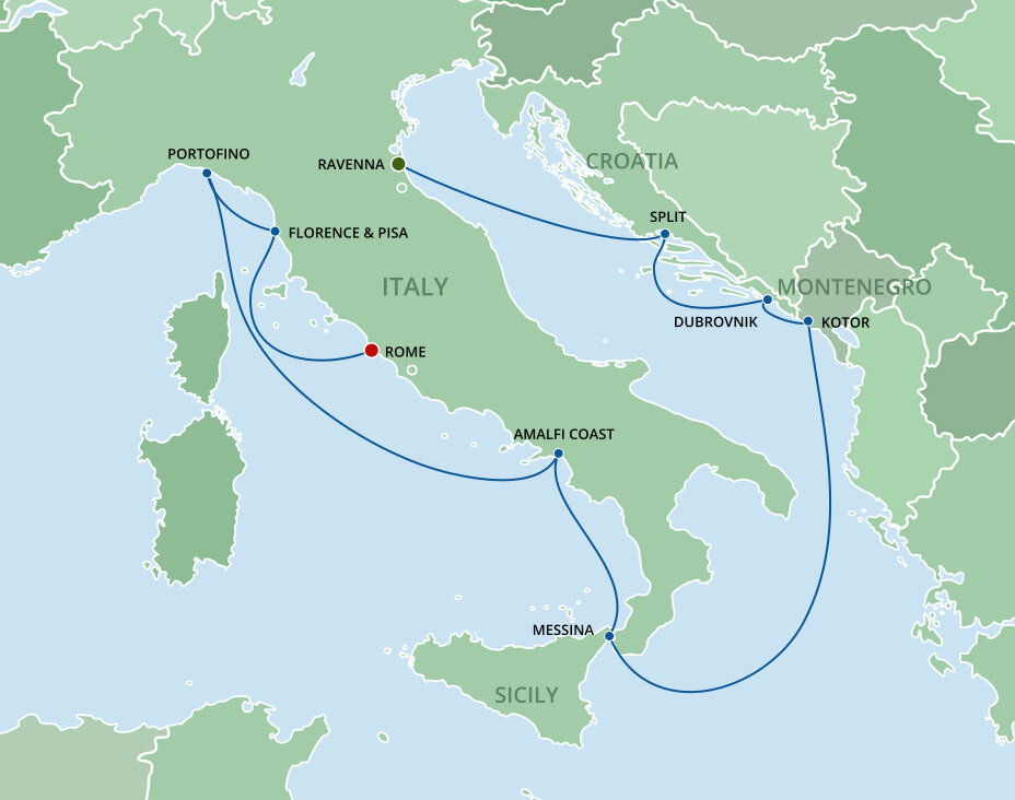 Ravenna, “The Mosaic City”, is best known for its churches, which date back 1,500 years and are decorated with stunning Byzantine mosaics. If you're travelling from Bologna, it's approximately 85 kms (53 miles) to Ravenna's port - Porto Corsini, and 140 kms (87 miles) from Venice - a journey that takes about 2 hours by train. Your cruise documents will outline your transfer options.