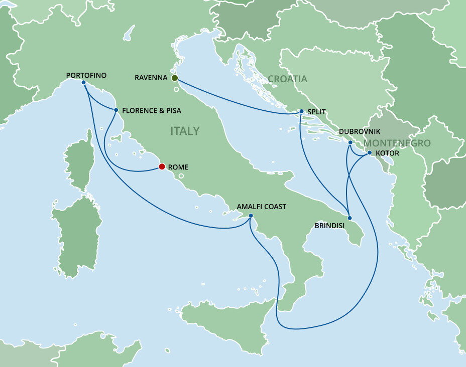 Brindisi, with its huge natural harbour and characterful ancient centre, is your gateway to the Puglia region. Located on the 'heel' of the Italian boot, the region is a well-kept secret offering a landscape of orchards and forests of olive trees. Ships will dock at the Porto di Brindisi.