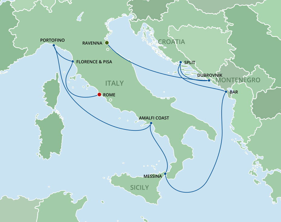 Ravenna, “The Mosaic City”, is best known for its churches, which date back 1,500 years and are decorated with stunning Byzantine mosaics. If you're travelling from Bologna, it's approximately 85 kms (53 miles) to Ravenna's port - Porto Corsini, and 140 kms (87 miles) from Venice - a journey that takes about 2 hours by train. Your cruise documents will outline your transfer options.