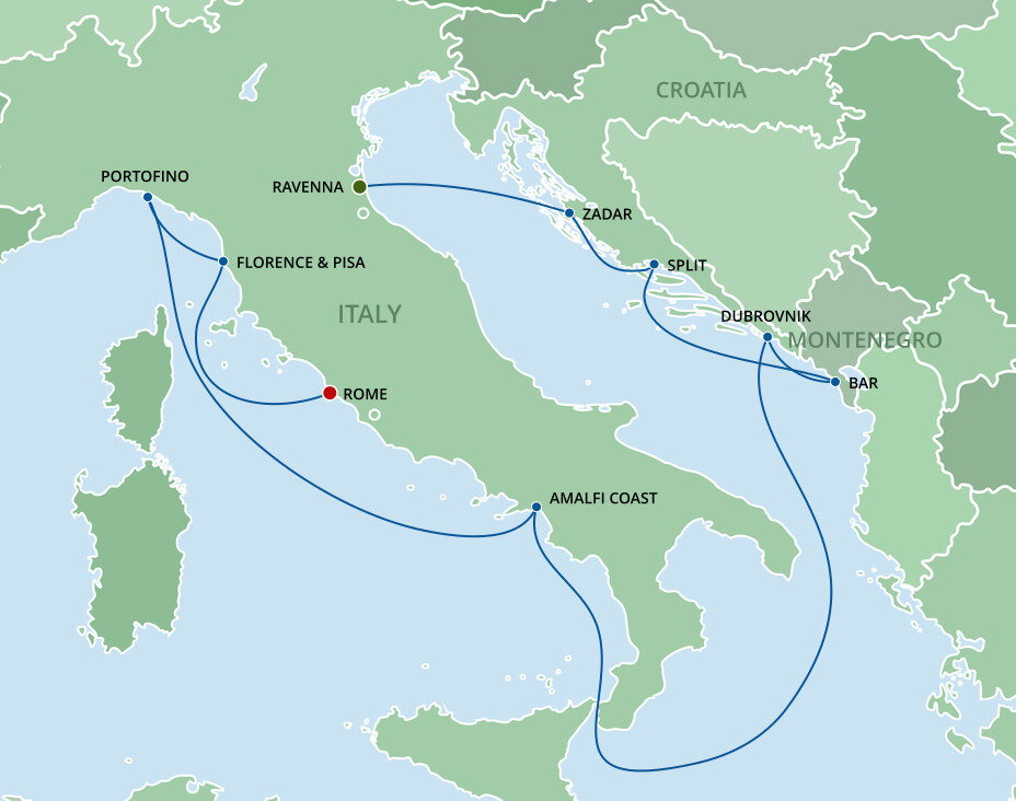 Ravenna, “The Mosaic City”, is best known for its churches, which date back 1,500 years and are decorated with stunning Byzantine mosaics. If you're travelling from Bologna, it's approximately 85 kms (53 miles) to Ravenna's port - Porto Corsini, and 140 kms (87 miles) from Venice - a journey that takes about 2 hours by train. Your cruise documents will outline your transfer options.