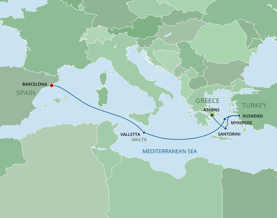 Your cruise finishes today in Barcelona, a captivating city on Spain's northeastern coast. If you're extending your stay in the city, start with a visit to La Sagrada Família, Antoni Gaudí's masterpiece, then wander through the narrow, historic streets of the Gothic Quarter.