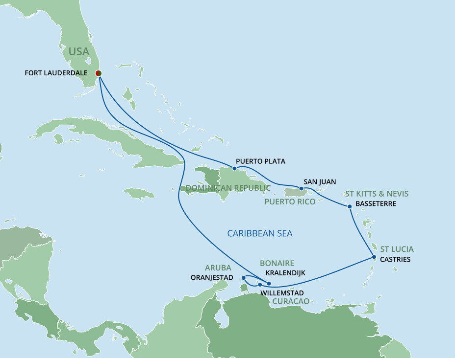 In the 1800s, William Lauderdale built a fort. Today, 16 million visitors come each year for miles of broad white sandy beaches, dozens of lush green golf courses, and Caribbean cruises from Fort Lauderdale. Stroll the famous beachfront promenade, just 15 minutes from the port, and plunge into the warm Atlantic. You’ll sail from Port Everglades. Fort Lauderdale-Hollywood International Airport is only a ten-minute drive from Port Everglades, and shuttle buses can take you from the airport to the cruise port. Free Wi-Fi and parking facilities are available at the port.