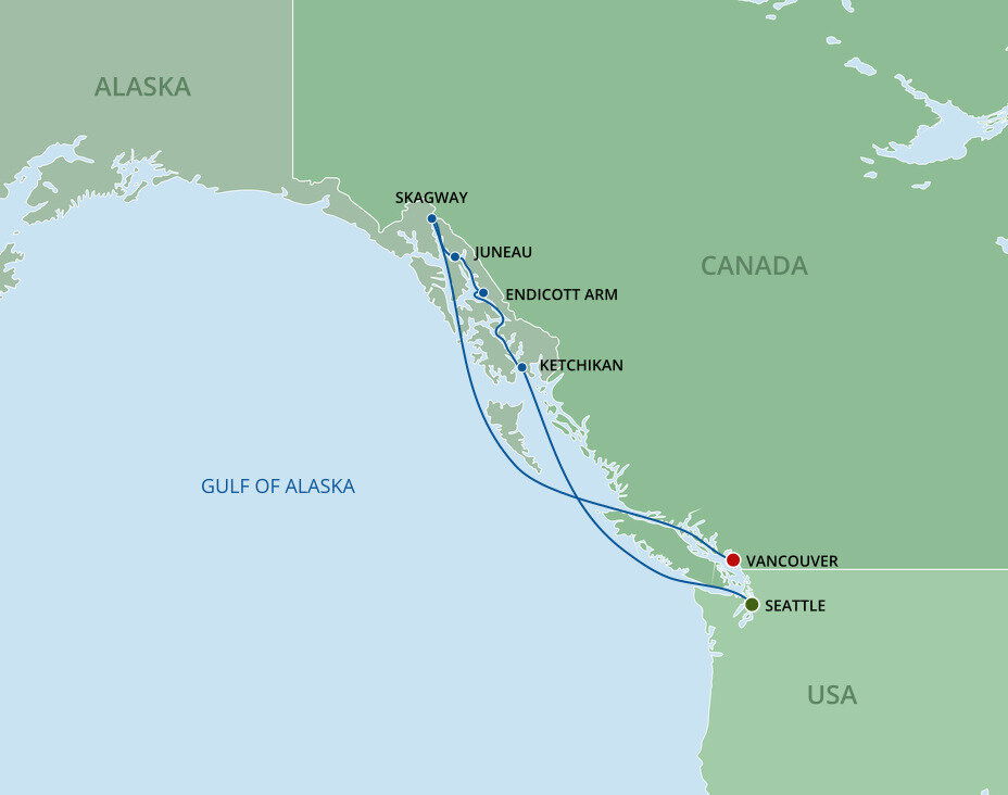 Alaska's Inside Passage offers breathtaking views of glaciers, fjords, and abundant wildlife , making it one of the most scenic cruises in the world and one of the few locations where deep-draft ships can sail close to steep mountain walls. Stretching from Puget Sound in Washington to the Alaskan Panhandle, this coastal route provides stunning natural scenery. Expect to see orcas, humpback whales, and sea lions from the deck, while eagles soar overhead.