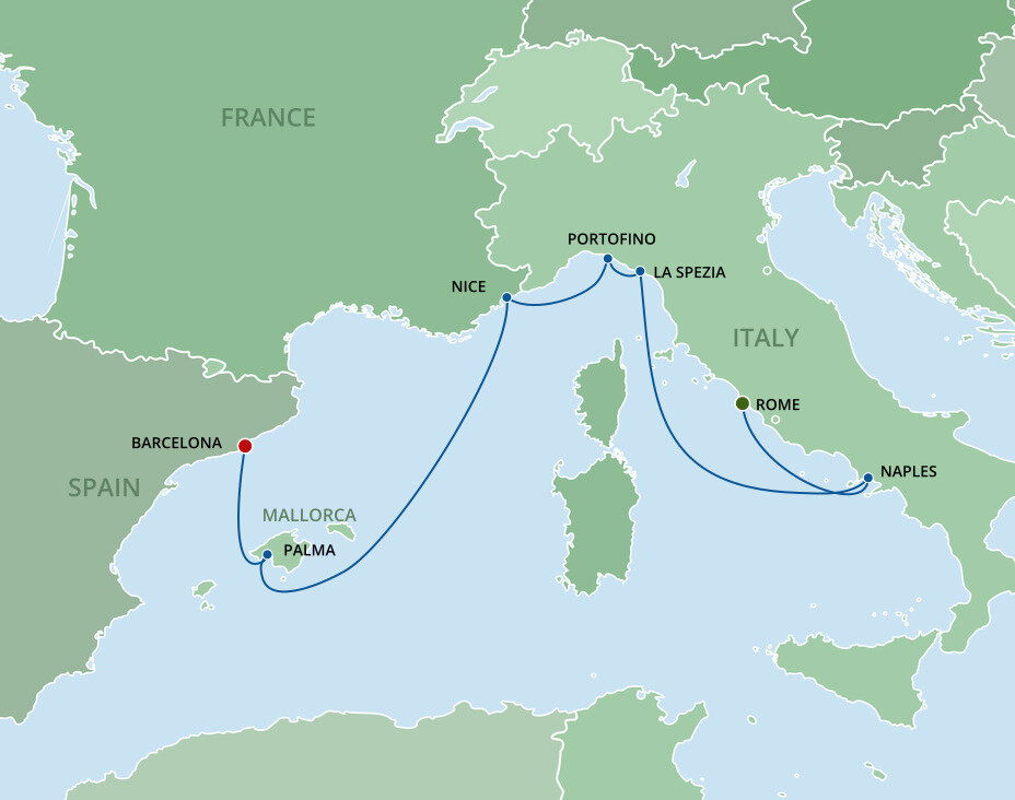 Your cruise finishes today in Barcelona, a captivating city on Spain's northeastern coast. If you're extending your stay in the city, start with a visit to La Sagrada Família, Antoni Gaudí's masterpiece, then wander through the narrow, historic streets of the Gothic Quarter.