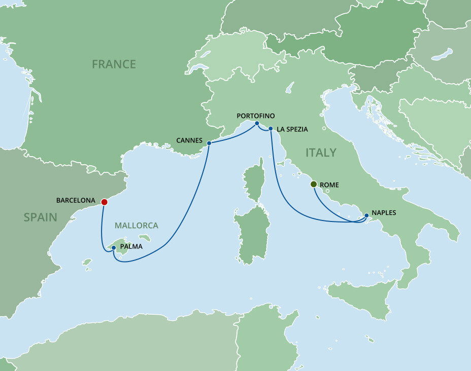 Your cruise finishes today in Barcelona, a captivating city on Spain's northeastern coast. If you're extending your stay in the city, start with a visit to La Sagrada Família, Antoni Gaudí's masterpiece, then wander through the narrow, historic streets of the Gothic Quarter.