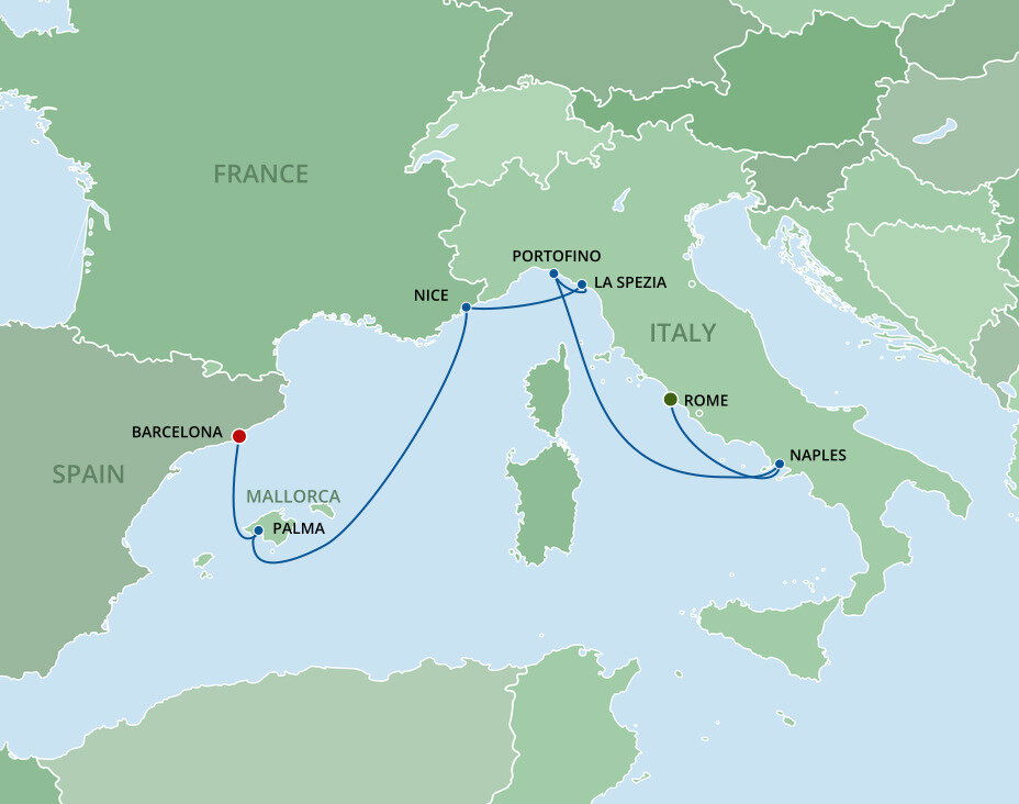 Your cruise finishes today in Barcelona, a captivating city on Spain's northeastern coast. If you're extending your stay in the city, start with a visit to La Sagrada Família, Antoni Gaudí's masterpiece, then wander through the narrow, historic streets of the Gothic Quarter.