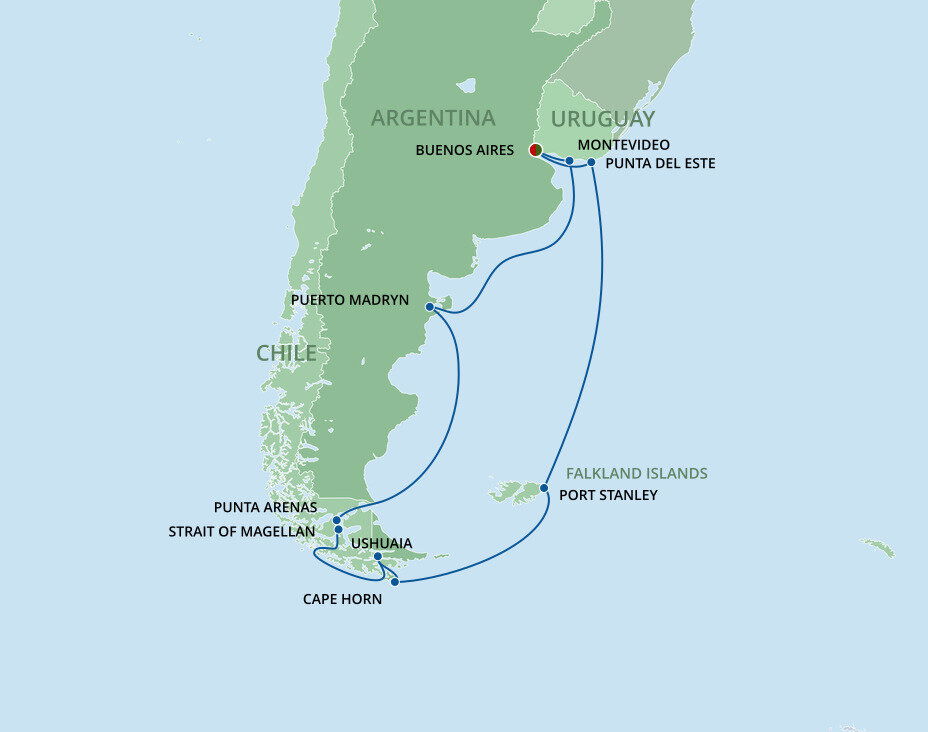 Located at the southernmost end of South America, Ushuaia is is often called a doorway to Antarctica. The town boasts incredible natural beauty through its national parks like the Tierra del Fuego National Park with cultural institutions like the Museo del Fin del Mundo, or the End of the World Museum. Ships will dock at this port.