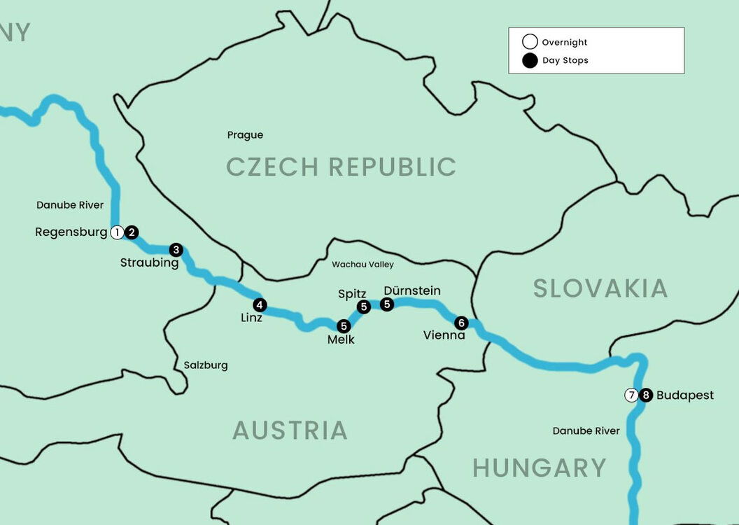 Sailing into Regensburg along the Danube leads you into one of Europe’s most beautifully preserved medieval cities. Designated a UNESCO World Heritage Site, Regensburg’s Old Town is a maze of cobblestone lanes and storied architecture, where each corner reveals another chapter from centuries past. Cross the iconic Stone Bridge and take in panoramic views of the river as it winds through the heart of the city’s vibrant streetscape.