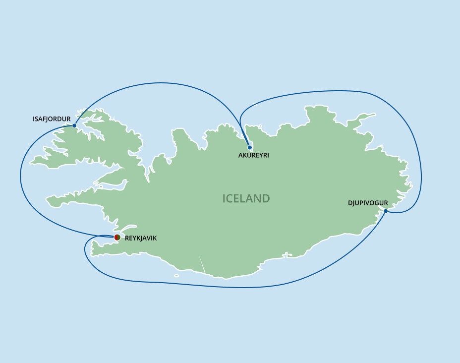 Iceland’s Capital of the North is the gateway to a thrilling land of roaring waterfalls, soaring volcanoes and glorious wildlife. Situated at the head of Eyjafjordur, Iceland's longest fjord and with a backdrop of dramatic snow-covered mountains, Akureyri is Iceland's second largest city. Ships will dock at the pier.