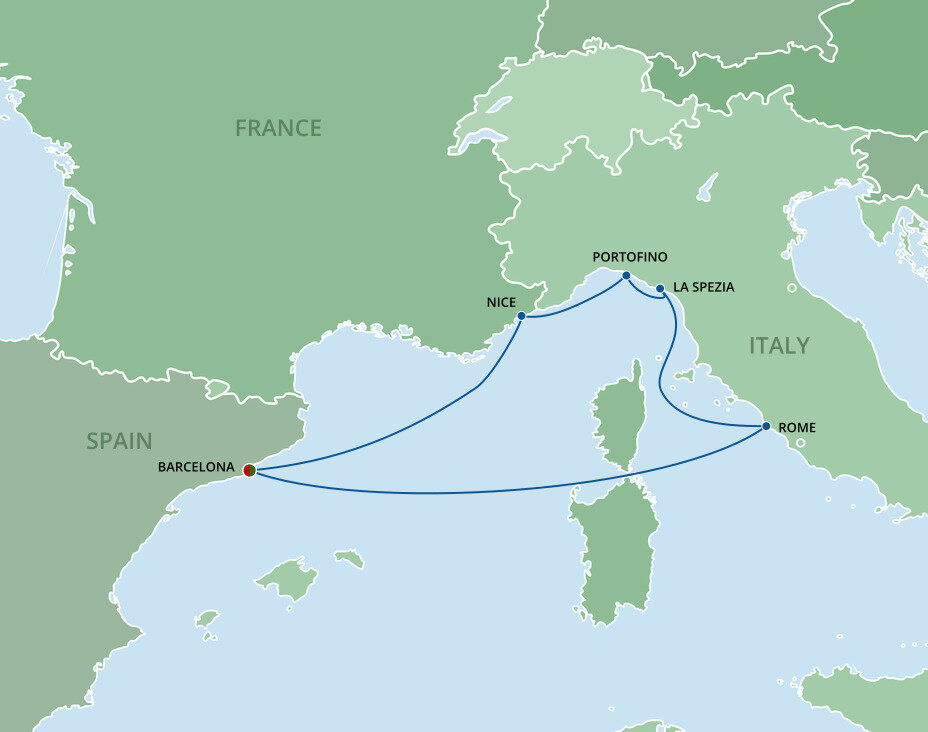 Your cruise finishes today in Barcelona, a captivating city on Spain's northeastern coast. If you're extending your stay in the city, start with a visit to La Sagrada Família, Antoni Gaudí's masterpiece, then wander through the narrow, historic streets of the Gothic Quarter.
