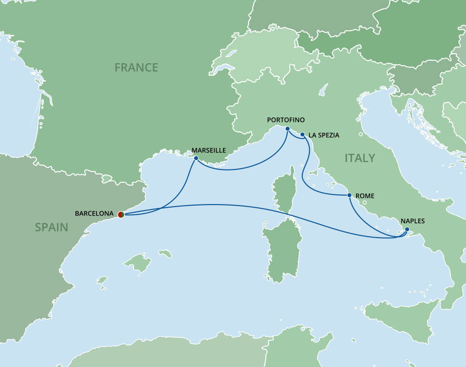Your cruise finishes today in Barcelona, a captivating city on Spain's northeastern coast. If you're extending your stay in the city, start with a visit to La Sagrada Família, Antoni Gaudí's masterpiece, then wander through the narrow, historic streets of the Gothic Quarter.