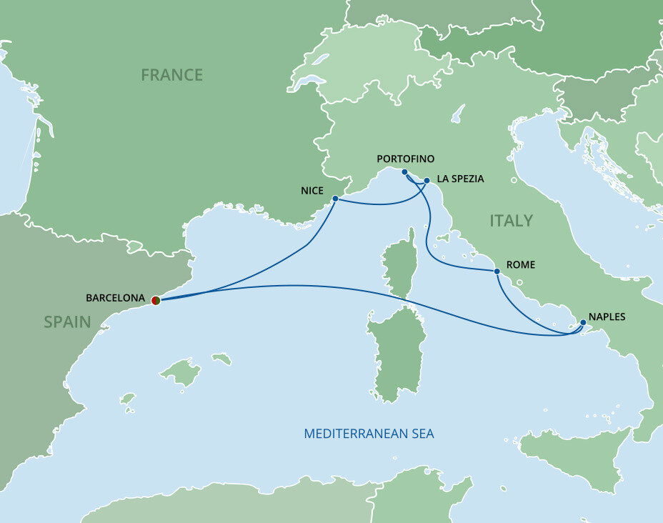Your cruise finishes today in Barcelona, a captivating city on Spain's northeastern coast. If you're extending your stay in the city, start with a visit to La Sagrada Família, Antoni Gaudí's masterpiece, then wander through the narrow, historic streets of the Gothic Quarter.
