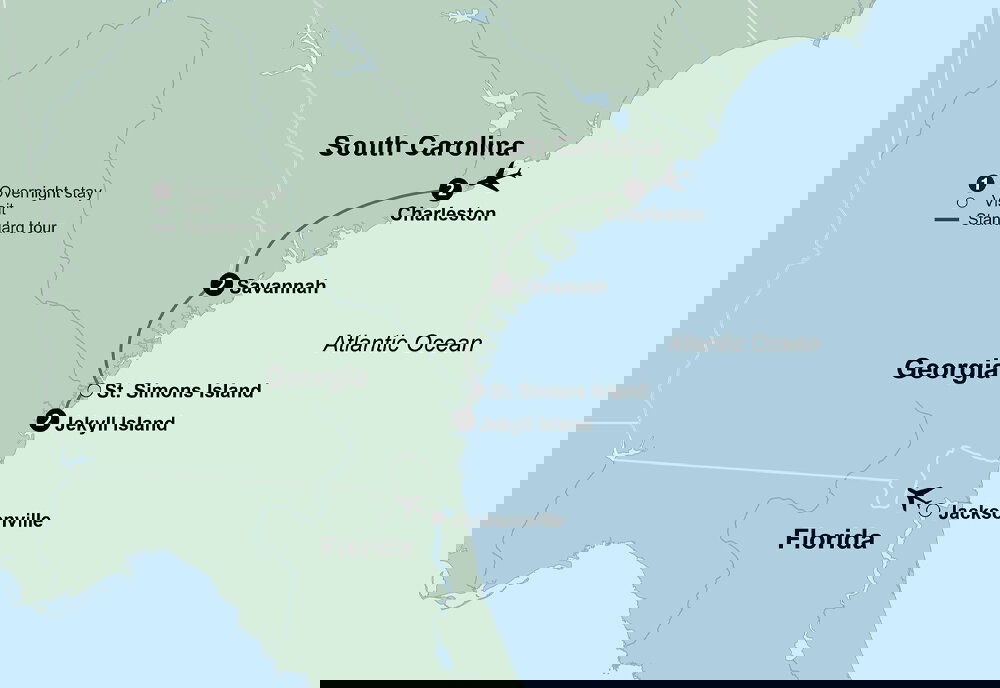 Experience warm Southern hospitality in America's southeast. Come to know its rich history and deep traditions on this tour highlighted by stays in Charleston, Savannah, and Jekyll Island. Arrive in Charleston, a city that has defied all odds. Charleston has survived the Civil War, major fires, an earthquake, and hurricanes – and still exudes elegance, charm, and grace.