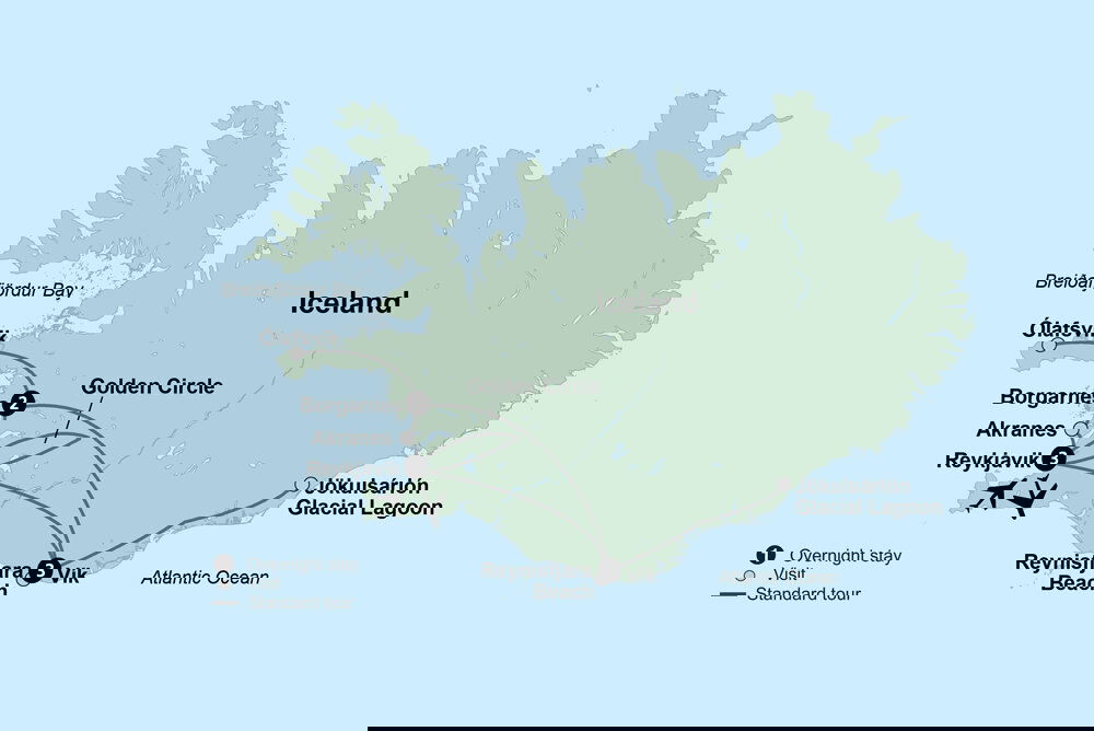 Drive along the scenic south shore to the Skógar Museum. Discover its turf-built houses and its collection of farm and domestic artifacts. Nearby, find the impressive Skógafoss waterfall, one of the tallest in Iceland. Behold Reynisfjara, a black volcanic sand beach scattered with caves and surrounded by basalt columns and cliffs. You might also spot some nesting puffins along the unique natural rock formations at Dyrhólaey, a volcanic peninsula towering over the ocean. And finally, take in stunning views on Sólheimajökull Glacier, part of Iceland's fourth largest ice cap. (B/D)