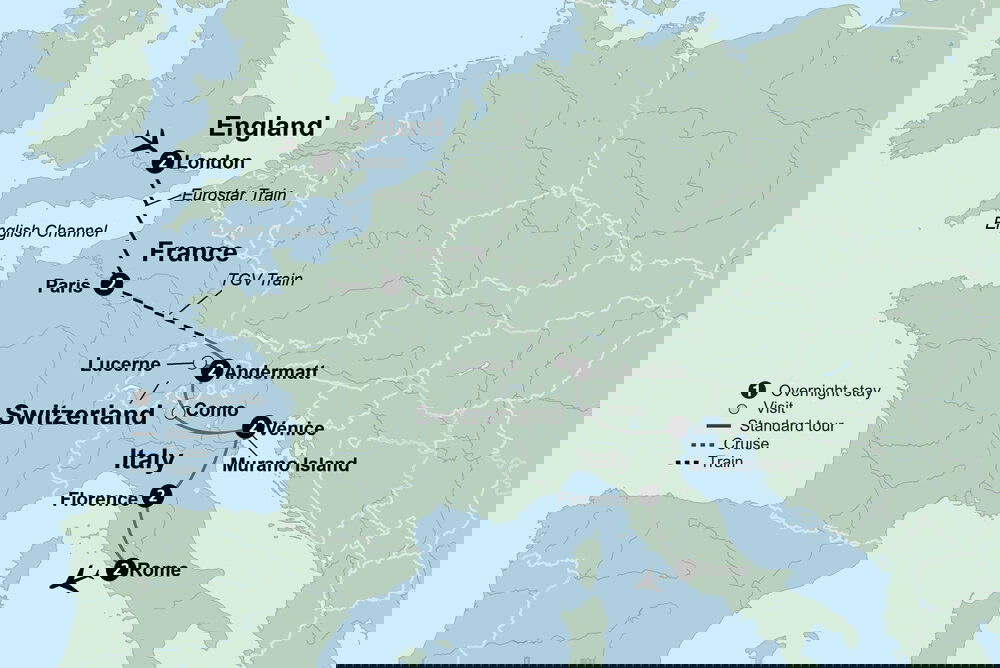 Travel south through the pastoral landscapes of Switzerland. Crossing into Italy, traverse through the heart of the Alps, taking in vistas of rugged mountains as far as the eye can see. Pass through the picturesque Italian Lake District – a holiday destination since Roman times, and pause in the lakeside city of Como, famous for its silk production. In the early evening, settle in for a 2-night stay in Mestre, situated on the Venetian mainland. (B/D) Stay: Leonardo Royal Venice, Mestre (2 Nights)