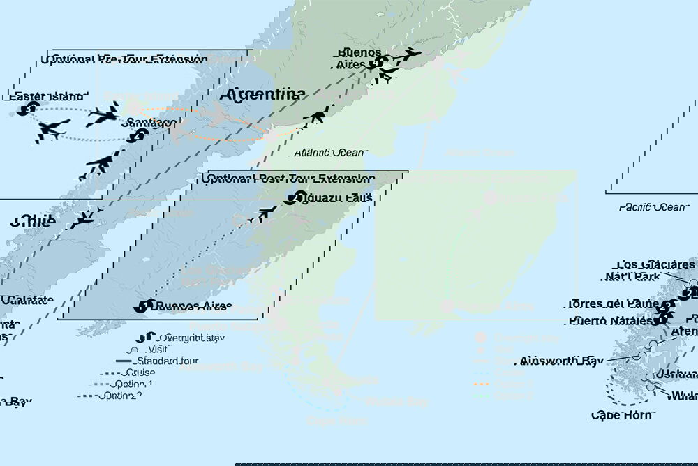Today, take in the vast landscape and learn more about Patagonian wildlife while traveling to the border and crossing into Chile. Arrive in Torres del Paine National Park, one of the most remote, unspoiled places in the world, designated a UNESCO Biosphere Reserve. Soak the dramatic beauty of jagged mountains, expansive grasslands, and ethereal teal waters and marvel at cascading waterfalls on a panoramic tour through one of South America's most incredible national parks. Along the way, you may spot soaring condors, inquisitive guanacos (llamas), and independent felines.