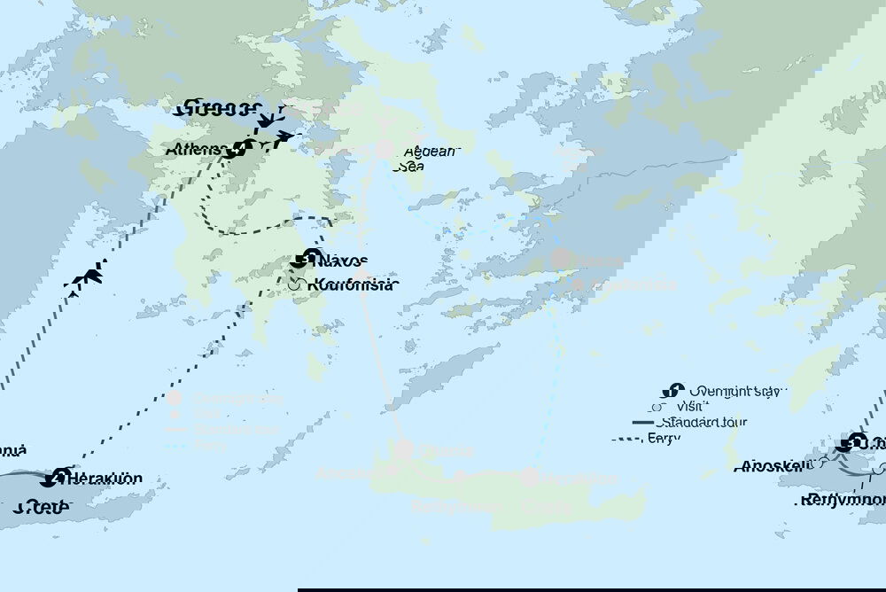 Enjoy the morning at leisure. Later this afternoon with your suitcase in tow, board the ferry to Heraklion, Crete. After a ferry trip, arrive in Crete, the largest of the Greek islands and get your first taste of Cretan cuisine with dinner at a local restaurant. (B/D) Stay: Olive Green Hotel (2 Nights)
