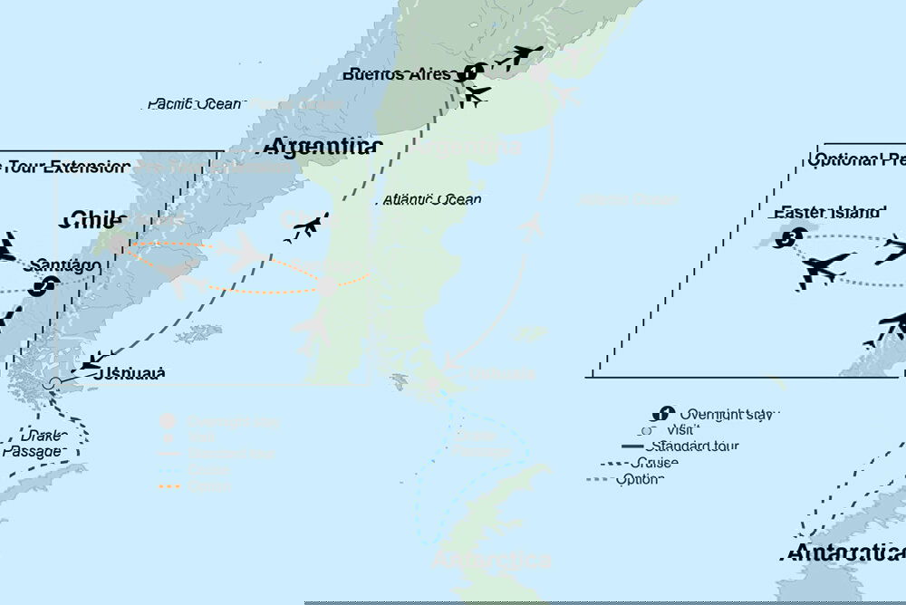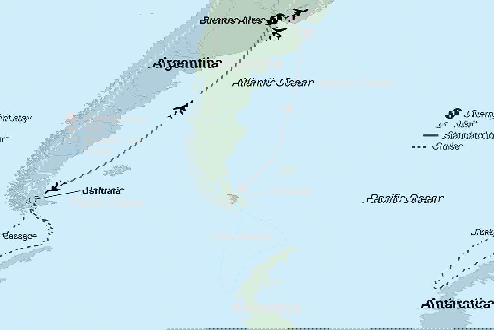 This morning we fly over Patagonia before landing in Ushuaia, the southernmost city in the world, surrounded by spectacular mountain scenery. Set out on a panoramic tour of Tierra del Fuego National Park and soak in this dramatic landscape on the southern tip of South America featuring glaciers, lakes, mountains, and waterfalls. From Ushuaia, embark the expedition ship that will be your home for the next nine days during a cruise to Antarctica. (B/L/D) Stay: Atlas World Navigator (9 Nights)