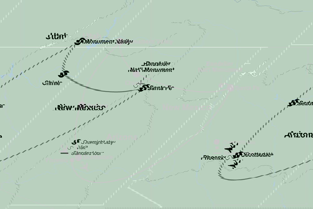 Delve into the spirit of America's Southwest, where striking desert landscapes are interwoven with the rich cultures and histories of Indigenous peoples. Arrive in New Mexico, the "Land of Enchantment," and begin your journey in Santa Fe — the multicultural state capital. With arrival times varying, there are no scheduled activities today. If time allows, you might acquaint yourself with this historically layered city, shaped by Indigenous, Spanish, Mexican, and other influences. Stay: Hilton Santa Fe Historic Plaza (3 Nights)