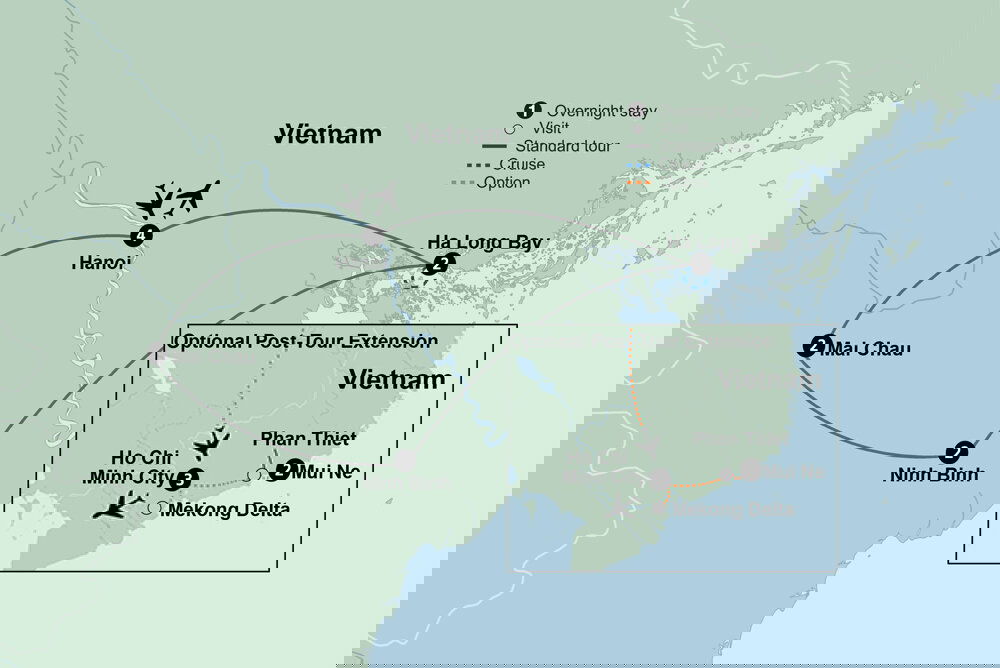Travel to Ha Long Bay and board a cruise boat for two spectacular nights. Pass through Trong Mai Islet, Ngon Tay Islet, and Con Coc Islet before arriving at a coastal village. Choose to explore by bicycle or electric cart, winding through the village and learning about daily life in this peaceful corner of Northern Vietnam.
