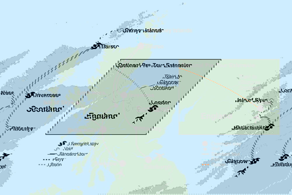 Today, enjoy stunning and unspoiled landscapes as you journey further into the Highlands. Travel through the Great Glen, famous for its many lochs (lakes). Visit the striking ruins of Urquhart Castle before enjoying a cruise on Loch Ness, one of Britain's most famous bodies of water. Keep your eyes open — you never know when Nessie might appear! Travel off the beaten path to Thurso, one of Scotland's most remote towns on the North Coast. Embrace the rustic environment of the Scottish Highlands as you settle in for your two-night stay. (B/D) Stay: Castletown Hotel (2 Nights)