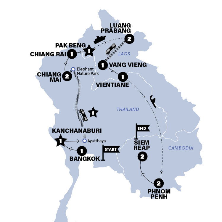 Later we'll rendezvous back at base so you can hear what's in store for the trip, then the night is yours to enjoy authentic Pad Thai & the Khao San road nightlife. Stay: Nouvo City Hotel (or similar)