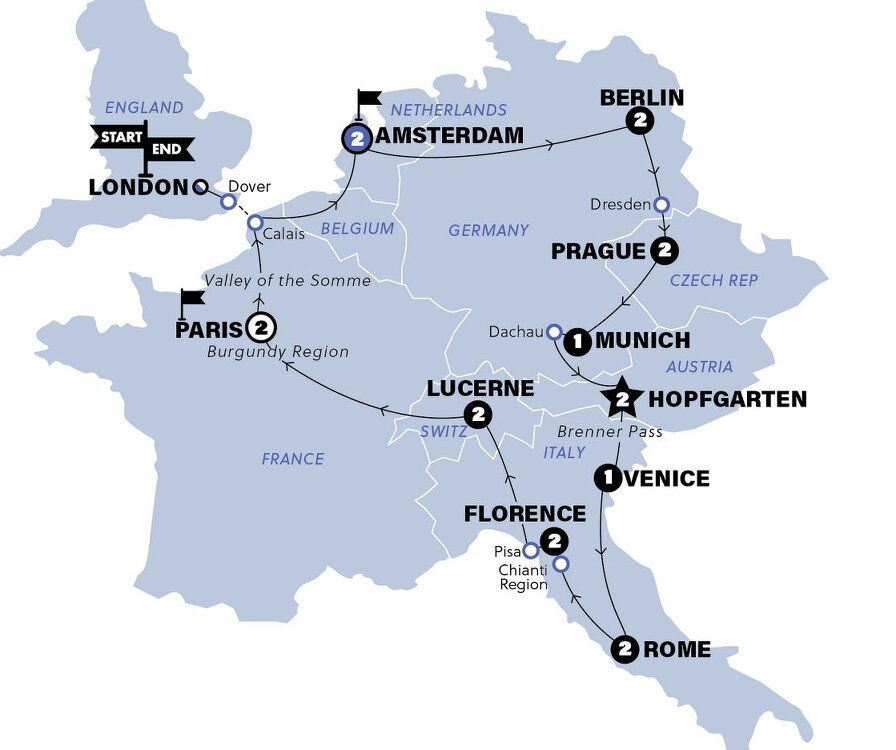 Off the ferry we arrive in the port town of Calais - French soil! We travel north through Belgium before reaching... Amsterdam! Tonight, the famed-for-fun Amsterdam is ours to explore. First fill up on your included group dinner, then you're free to explore or hit the local bars. (D) Stay: Holiday Inn Express Amsterdam North Riverside (or similar)