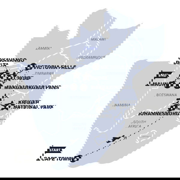 Rise & shine, explorers! Especially if you wanna choose to take the sunrise game drive (more game drives = more chances of ticking everything off that list). Or you could always choose to sleep in and catch a late brekkie. The game of hide and seek then continues one last time as we head back into the park, keeping our eyes open for any wildlife that's evaded us so far (come on cheetah... where are you) and bid farewell to Kruger. We'll head off to Johannesburg this afternoon. Order of business? Crash at the hotel before we fly to Victoria Falls in the morning! (B) Stay: Sunrock Guesthouse (or similar)