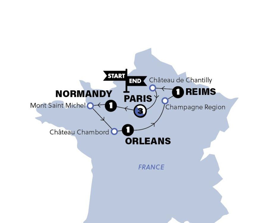 Normandy: Morning, sleeping beauties. Today's agenda is all about jaw-dropping views. So freshen up, feast on breakfast and hop on! Mont Saint Michel:Cameras at the ready! This beautiful island (topped with a charming Abbey) will have you swooning over its unique perfect silhouette.