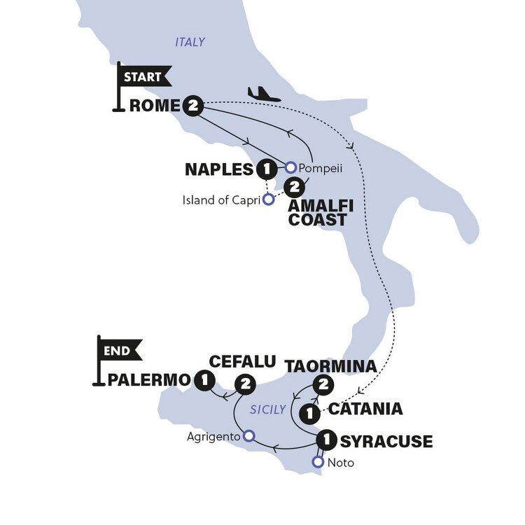 Today we're hopping on a speedy flight to the incomparable isle of Sicily. This colourful cacophony of baroque piazzas and ancient ruins is the perfect place to get acquainted with Sicily. We'll have a chance to check out Catania's UNESCO listed historic core before an included dinner in a local restaurant. Can you taste the difference in Sicilian cuisine? It has to be up there... (B/D) Stay: Hotel Villa Del Bosco (or similar)