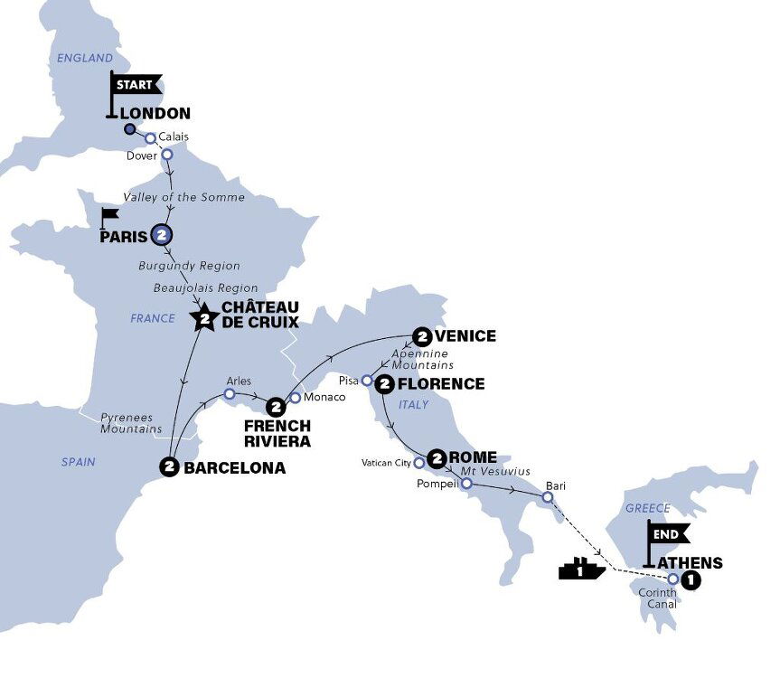 After a dreamy drive across the border into France through landscapes of lavender, sunflowers and wild herbs, we'll arrive at our lunch break town of Arles. Here we will get a peek at an ancient Roman Arena and at a typical provincial French town. You're not a real celebrity until you've frolicked on the French Riviera, and who are we to keep you off the A-List? Sapphire waters & endless glamour as we roll through this glitzy coastline. (B/D) Stay: Hôtel Amarante Cannes (or similar)
