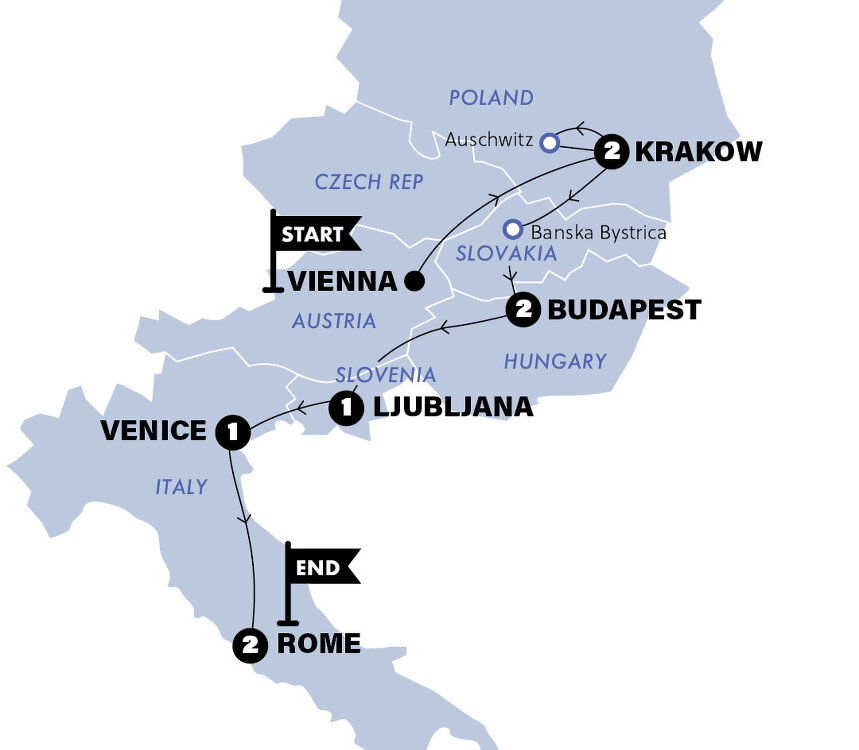 Hello and welcome to Vienna! Say hello to your new crew before we jump right into our very first day of adventure. Today we will change pace once we cross the border, as we drop to an unfamiliar and sobering level by visiting the concentration camp memorials of Auschwitz & Birkenau. Learning and growing is what we travellers do.