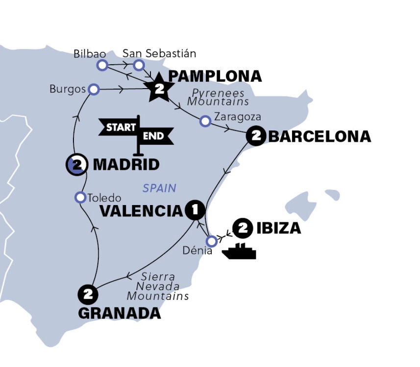 It's been a magical time on this island, but we have the rest of Spain to explore. With Ibiza ticked off our bucket list, we'll hop on a ferry back to the mainland. Touching down in Denia we'll jump on our coach, headed for Valencia. It's hard to not be enchanted by the port city of Valencia, where beach meets culture in the happiest way possible. With one night here in the land that invented paella it would be crazy not to sign up for an optional paella-making class tonight with the crew. Who's in? (B) Stay: Hotel Mas Camarena Valencia (or similar)