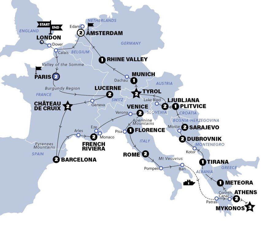 This afternoon we cross from France to England and then back to London-town, where you'll be left to start dreaming up your next big adventure. (B)