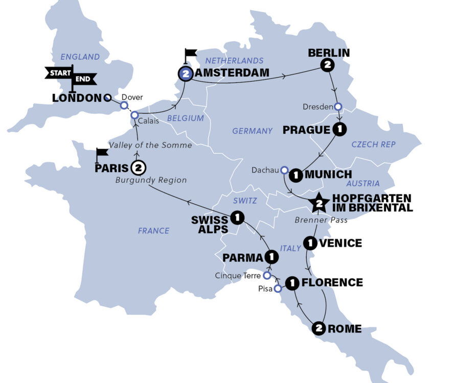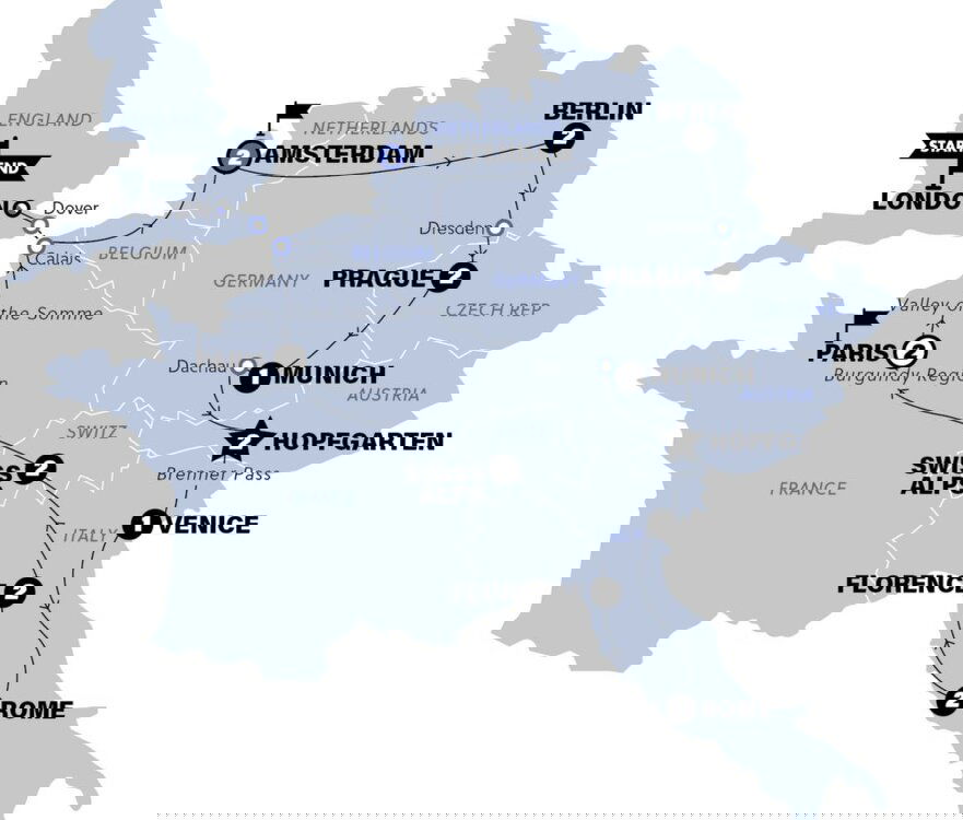 We travel north through Belgium before reaching... Amsterdam! Tonight, the famed-for-fun Amsterdam is ours to explore. First fill up on your included group dinner, then you're free to explore or hit the local bars. And if you want a jaw-dropping view of the city from up above, might we interest you with an optional visit to the A'DAM tower? (D) Stay: Via Hostel Amsterdam (or similar)