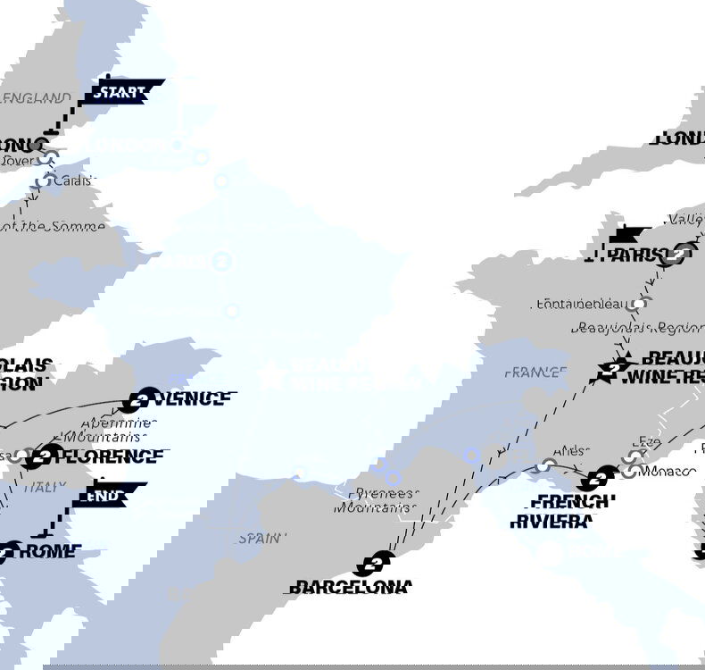 Bye-bye Beajoulais! And hello Barcelona. The Pyrénées mountains will keep our eyes satisfied today as we roll across the border for Spain's most lively city. Each day as sweet as the last. Well would you look at that for timing, we've pulled into Barcelona just on sangria o'clock. Fate, you've done it again! A scrumptious Spanish feast and a night exploring this culturally rich city should have us in the fiesta mood soon enough. (B/D) Stay: Urbany Hostel (or similar)