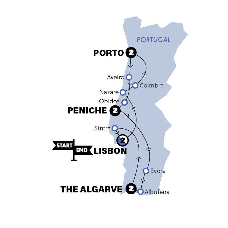 We're saying 'Tchau' to Porto today. After breakfast we're taking the coach towards Santa Cruz. This mini-Venice is a gorgeous town built on canals. We'll have an optional traditional boat tour to cruise the winding canals, admiring the colourful houses. Another stop for lunch, another stunning historic old town to enjoy it in. Obidos will charm us with its whitewashed houses and ruddy blooms of flowers.