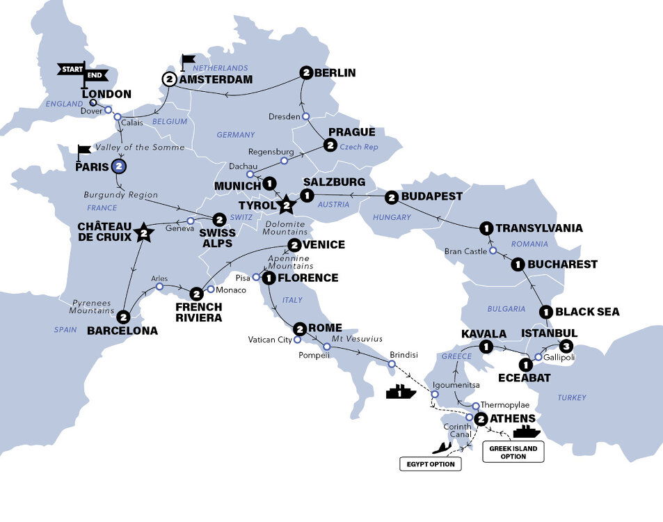 After we ferry across the English Channel for France we'll arrive in Calais, where we will pass through the World War I battlefields in the Valley of the Somme. Kicking off night one, we arrive in none other than the lust-worthy Paris. You have the chance to see the Eiffel Tower tonight, but save some of the views for the city tour tomorrow! (D) Stay: Generator (or similar)
