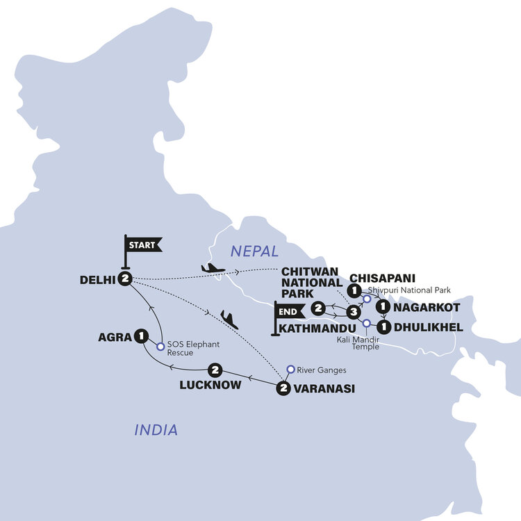 Jumping on our air-conditioned coach we'll head to our next stop... We'll visit the Wildlife SOS Elephant Rescue Centre, where we'll meet over 20 rescued elephants and witness the only elephant hospital in Asia. Wasting no time this afternoon, we're getting a speedy flight to Kathmandu, Nepal... We've arrived into Kathmandu! (B) Stay: Hotel Majestic & Spa (or similar)