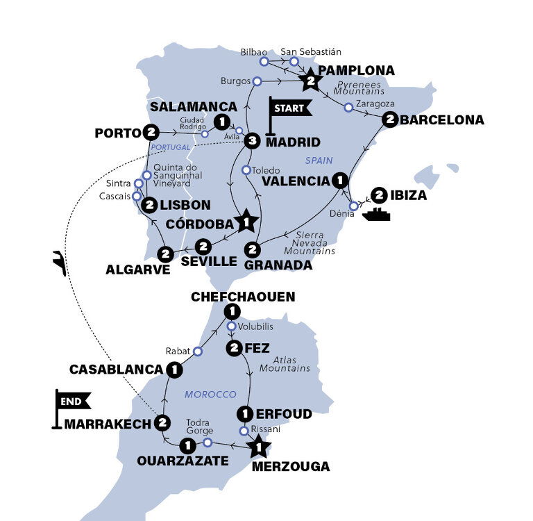 Welcome to Spain! Join up with your new crew tonight over your first group dinner in the metro magic of Madrid. Tomorrow will be a whole world of discovery, so you'll be thankful for your hotel sleep. (D) Stay: AC Hotel Madrid Feria (or similar)
