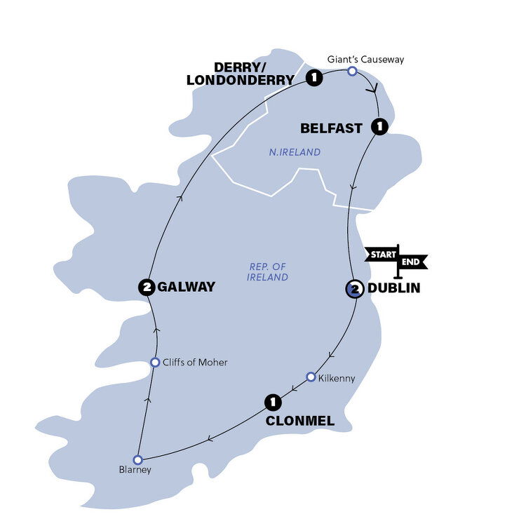 Céad míle fáilte, meaning one hundred thousand welcomes, is what you get in this city packed with heritage, character, and more cute pubs than you could crawl in a week. Meet up with your Trip Manager this afternoon, then meet your new travel squad for dinner and end the day with a lively night of festivities at the cobbled lanes of Temple Bar. Guinness, anyone? (D) Stay: Travelodge Plus Dublin City Centre (or similar)