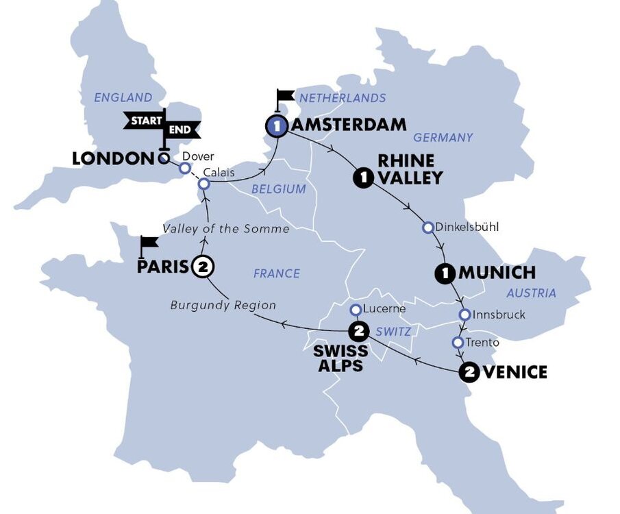 'Auf Wiedersehen' Munich, we're off to tick more countries off our list. This morning we'll climb aboard our coach ready for a scenic roll through the Bavarian Alps, past fairytale castles and rambling vineyards, en route to Austria. Drive through Austria without getting out to say hello? Never! We'll pull into Innsbruck for lunch, a laid-back student city made famous by a medieval old town, an old Olympic Ski Jump & a Royal Palace. Quick pitstop for dinner! We'll check out the charming little city of Trento, right in the heart of the oh-so-beautiful Adige Valley. Ah, Venice! Fresh pasta, lilting accents & romantic architecture - we've arrived in one of Italy's most famous cities.