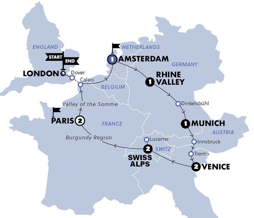 'Auf Wiedersehen' Munich, we're off to tick more countries off our list. This morning we'll climb aboard our coach ready for a scenic roll through the Bavarian Alps, past fairytale castles and rambling vineyards, en route to Austria. Drive through Austria without getting out to say hello? Never! We'll pull into Innsbruck for lunch, a laid-back student city made famous by a medieval old town, an old Olympic Ski Jump & a Royal Palace.