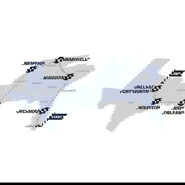 You can leave your Mickey ears on, but we're on the move again today... Our stop-off for today is Savannah, known for its cathedrals and majestic water fountains. Keep your eyes peeled for horse-drawn carriages as we check out the pretty parks. Augusta is home to the world-famous Masters Golf Course.