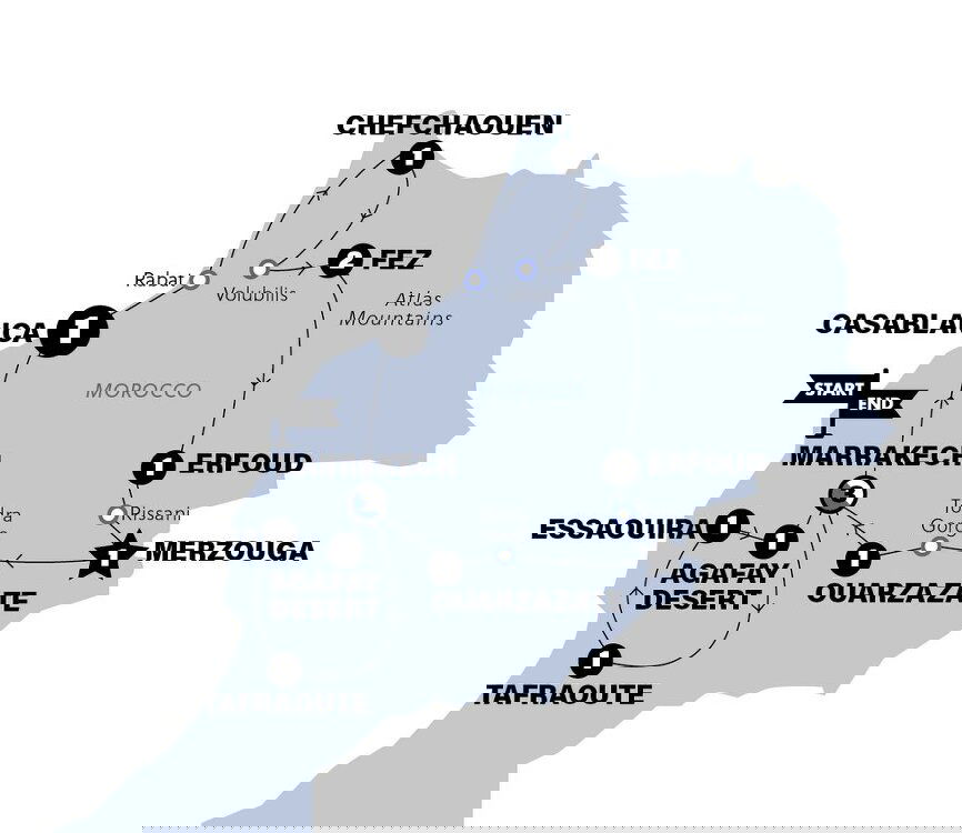 Today we'll get to explore the sights and sounds of Marrakesh on a sightseeing tour and discover what this city is all about. You'll be sure to see the likes of Koutoubia Mosque, Jemaa El-Fna and Bahia Palace (tickets are available at an extra cost if you'd like to explore the Palace). Then its time to move on to our next destination... Welcome the Casablanca, the iconic city of Hollywood legend. For our first adventure, we'll wander the cornice and soak up all of those coastal views. (B/D) Stay: Hotel Diwan (or similar)